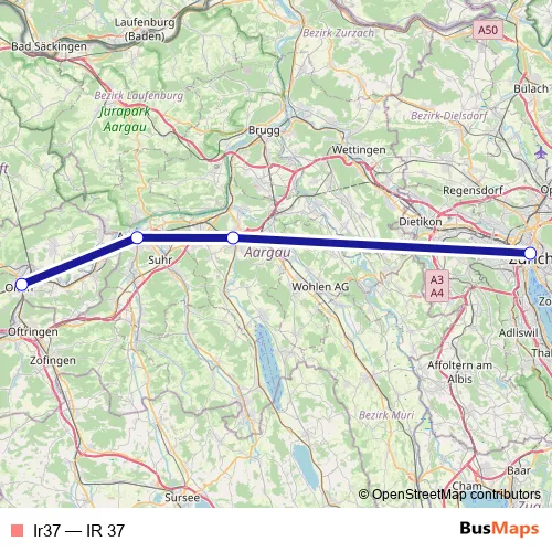 The first stop of the Ir37 rail route is Zürich Hb and the last stop is Olten. Ir37 (IR 37) is operational during on weekends.