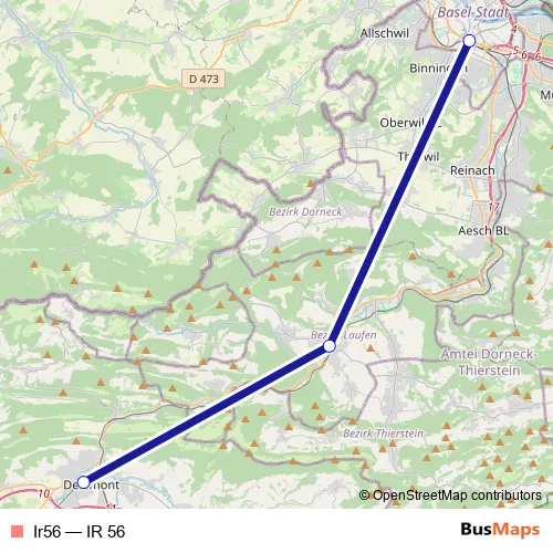 The first stop of the Ir56 rail route is Basel Sbb and the last stop is Delémont. Ir56 (IR 56) is operational during on weekdays.