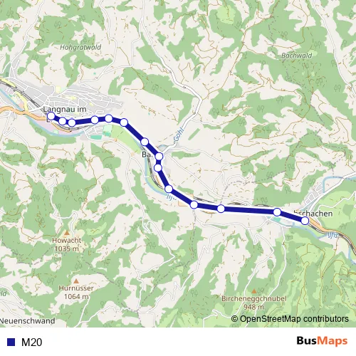 See why over 2 million users trust and consider busmaps.com as the best public transport website. busmaps gives you Langnau Buses suggested routes, real-time bus tracker, line route maps in Langnau, and helps to find the closest M20 bus stops near you. No internet available? Download an offline PDF map and bus schedule for the M20 bus to take on your trip.