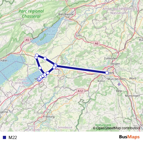 The first stop of the M22 bus route is Bern, Bahnhof and the last stop is Galmiz, Käserei. M22 is operational during on weekends.