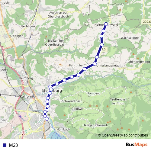 The first stop of the M23 bus route is Heimenschwand, Post and the last stop is Thun, Bahnhof. M23 is operational during on weekends.