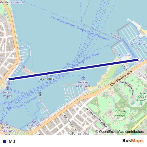 The first stop of the M3 ferry route is Genève-Port Noir (lac) and the last stop is Genève-Pâquis (lac). M3 is operational during everyday.