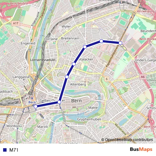 See why over 2 million users trust and consider busmaps.com as the best public transport website. busmaps gives you Bern Buses suggested routes, real-time bus tracker, line route maps in Bern, and helps to find the closest M71 bus stops near you. No internet available? Download an offline PDF map and bus schedule for the M71 bus to take on your trip.