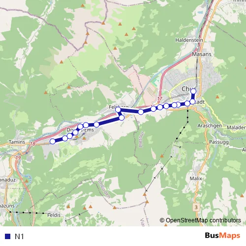 The first stop of the N1 bus route is Chur, Bahnhofplatz and the last stop is Domat/Ems, Chemie. N1 is operational during everyday.