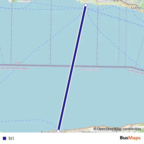 The first stop of the N1 ferry route is Evian-les-Bains (F) (lac) and the last stop is Lausanne-Ouchy (lac). N1 is operational during everyday.