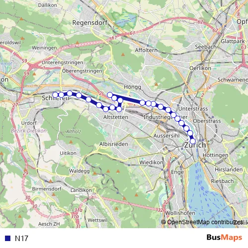 See why over 2 million users trust and consider busmaps.com as the best public transport website. busmaps gives you Zuerich Buses suggested routes, real-time bus tracker, line route maps in Zuerich, and helps to find the closest N17 bus stops near you. No internet available? Download an offline PDF map and bus schedule for the N17 bus to take on your trip.