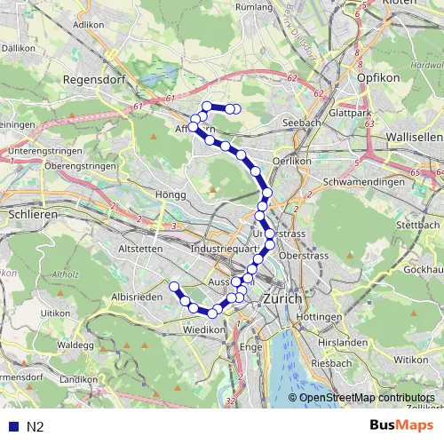 See why over 2 million users trust and consider busmaps.com as the best public transport website. busmaps gives you Zuerich Buses suggested routes, real-time bus tracker, line route maps in Zuerich, and helps to find the closest N2 bus stops near you. No internet available? Download an offline PDF map and bus schedule for the N2 bus to take on your trip.