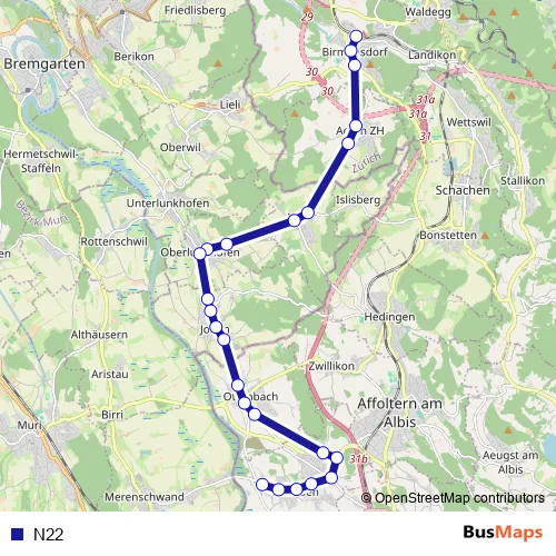 The first stop of the N22 bus route is Birmensdorf ZH, Bahnhof and the last stop is Obfelden, Unterlunnern. N22 is operational during on weekends.