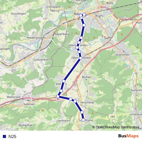 The first stop of the N25 bus route is Schöftland, Bahnhof and the last stop is Aarau, Bahnhof. N25 is operational during on weekends.