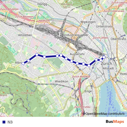 The first stop of the N3 bus route is Zürich, Albisrieden and the last stop is Zürich, Bahnhofplatz/Hb. N3 is operational during on weekends.