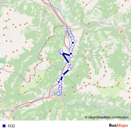 See why over 2 million users trust and consider busmaps.com as the best public transport website. busmaps gives you Chur Buses suggested routes, real-time bus tracker, line route maps in Chur, and helps to find the closest N32 bus stops near you. No internet available? Download an offline PDF map and bus schedule for the N32 bus to take on your trip.