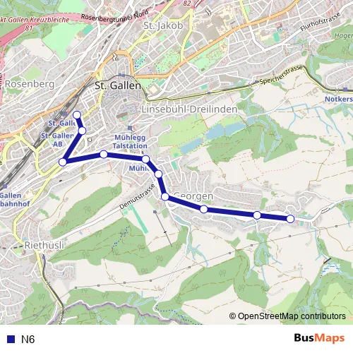 The first stop of the N6 bus route is St. Gallen, Bahnhof and the last stop is St. Gallen, Bach St. Georgen. N6 is operational during on weekends.