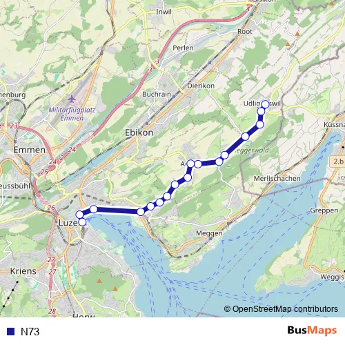 The first stop of the N73 bus route is Udligenswil, alte Post and the last stop is Luzern, Bahnhof. N73 is operational during on weekends.