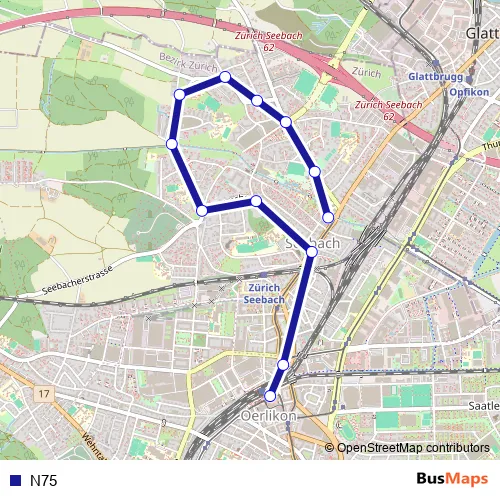 The first stop of the N75 bus route is Zürich, Seebach and the last stop is Zürich Oerlikon, Bahnhof. N75 is operational during on weekends.