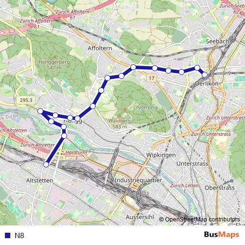 See why over 2 million users trust and consider busmaps.com as the best public transport website. busmaps gives you Zuerich Buses suggested routes, real-time bus tracker, line route maps in Zuerich, and helps to find the closest N8 bus stops near you. No internet available? Download an offline PDF map and bus schedule for the N8 bus to take on your trip.