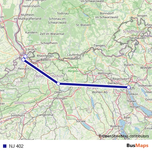 The first stop of the NJ 402 rail route is Zürich Hb and the last stop is Basel Bad Bf. NJ 402 is operational during everyday.