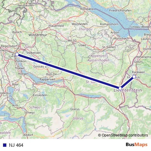 The first stop of the NJ 464 rail route is Feldkirch and the last stop is Zürich Hb. NJ 464 is operational during on weekends.