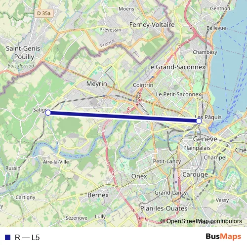 The first stop of the R rail route is Satigny and the last stop is Genève. R (L5) is operational during everyday.