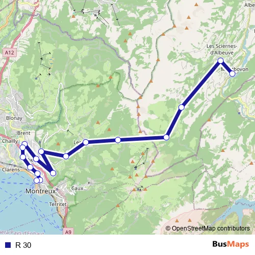 The first stop of the R 30 rail route is Montbovon and the last stop is Montreux. R 30 is operational during everyday.