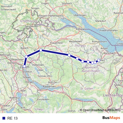 The first stop of the RE 13 rail route is St. Gallen and the last stop is Zürich Hb. RE 13 is operational during on weekends.