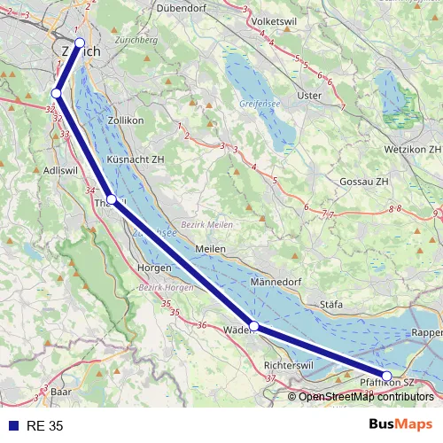 The first stop of the RE 35 rail route is Zürich Hb and the last stop is Pfäffikon Sz. RE 35 is operational during on weekends.