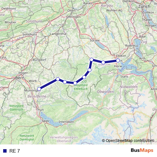 The first stop of the RE 7 rail route is Luzern and the last stop is Konolfingen. RE 7 is operational during on weekends.