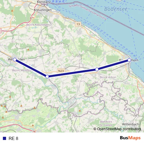 The first stop of the RE 8 rail route is Weinfelden and the last stop is Romanshorn. RE 8 is operational during everyday.