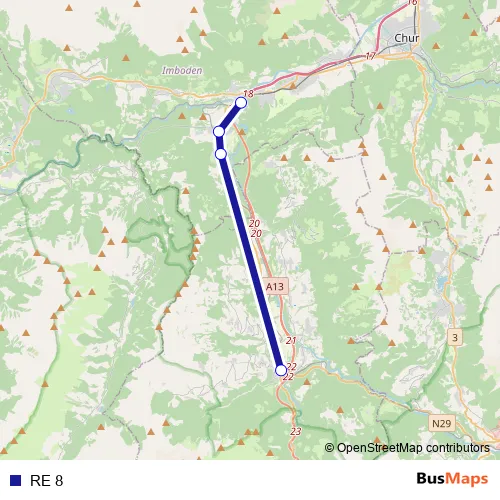 The first stop of the RE 8 rail route is Thusis and the last stop is Chur. RE 8 is operational during everyday.