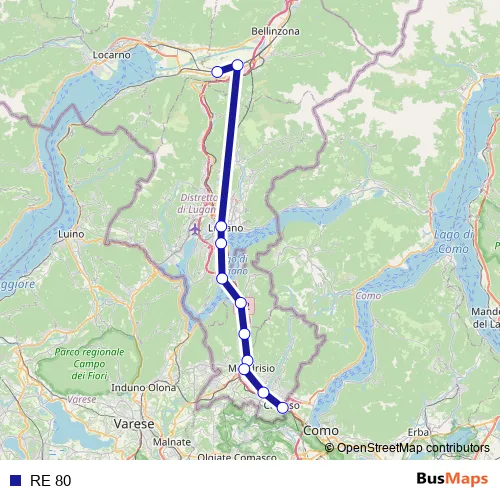 The first stop of the RE 80 rail route is Cadenazzo and the last stop is Chiasso. RE 80 is operational during everyday.