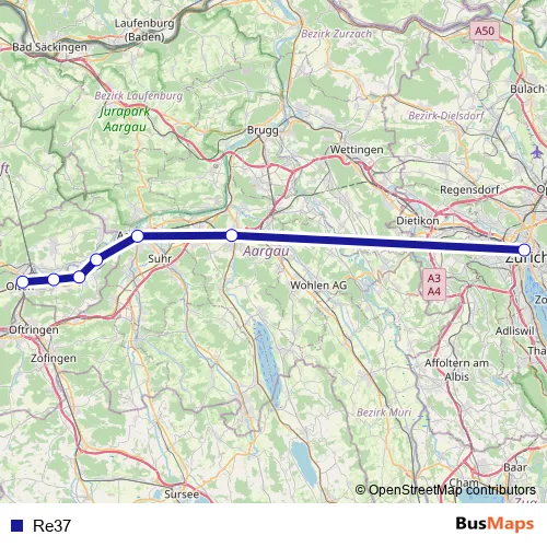The first stop of the Re37 rail route is Aarau and the last stop is Zürich Hb. Re37 is operational during everyday.