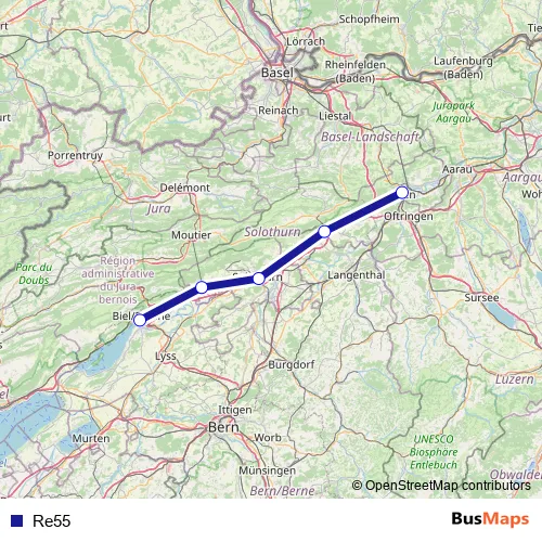 The first stop of the Re55 rail route is Olten and the last stop is Biel/Bienne. Re55 is operational during on weekends.
