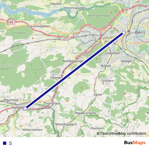 The first stop of the S rail route is Flamatt and the last stop is Bern. S is operational during everyday.