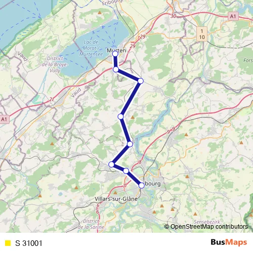 The first stop of the S 31001 rail route is Fribourg/Freiburg and the last stop is Murten/Morat. S 31001 is operational during everyday.