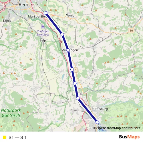 The first stop of the S1 rail route is Gümligen and the last stop is Thun. S1 (S 1) is operational during everyday.