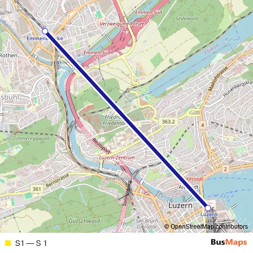 The first stop of the S1 rail route is Luzern and the last stop is Emmenbrücke. S1 (S 1) is operational during everyday.