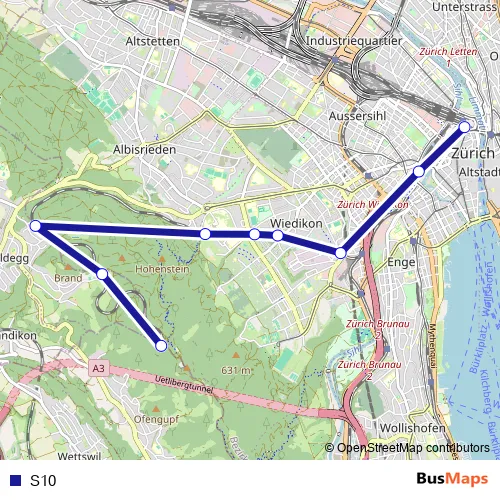 The first stop of the S10 rail route is Zürich Hb and the last stop is Uetliberg. S10 is operational during everyday.