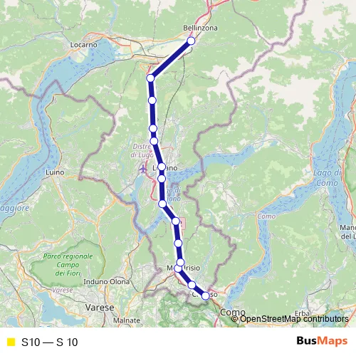 The first stop of the S10 rail route is Chiasso and the last stop is Giubiasco. S10 (S 10) is operational during everyday.