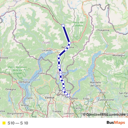 The first stop of the S10 rail route is Biasca and the last stop is Chiasso. S10 (S 10) is operational during everyday.