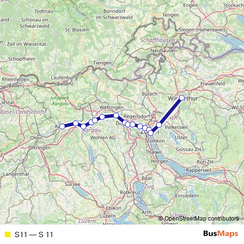The first stop of the S11 rail route is Aarau and the last stop is Winterthur. S11 (S 11) is operational during everyday.