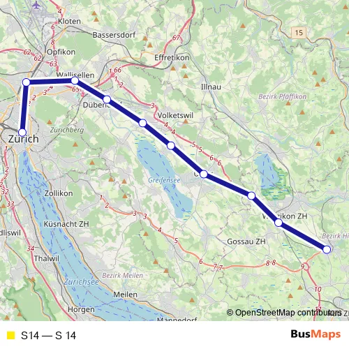 The first stop of the S14 rail route is Zürich Hb and the last stop is Hinwil. S14 (S 14) is operational during everyday.