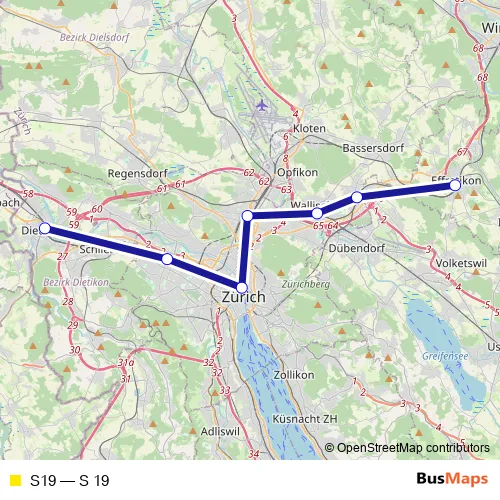 The first stop of the S19 rail route is Effretikon and the last stop is Dietikon. S19 (S 19) is operational during on weekdays.