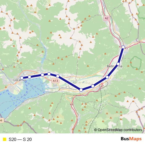 The first stop of the S20 rail route is Locarno and the last stop is Castione-Arbedo. S20 (S 20) is operational during everyday.