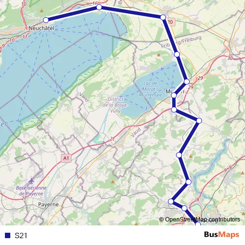 The first stop of the S21 rail route is Fribourg/Freiburg and the last stop is Neuchâtel. S21 is operational during everyday.