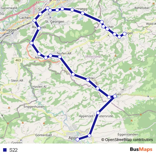 The first stop of the S22 rail route is Trogen and the last stop is Appenzell. S22 is operational during on weekdays.