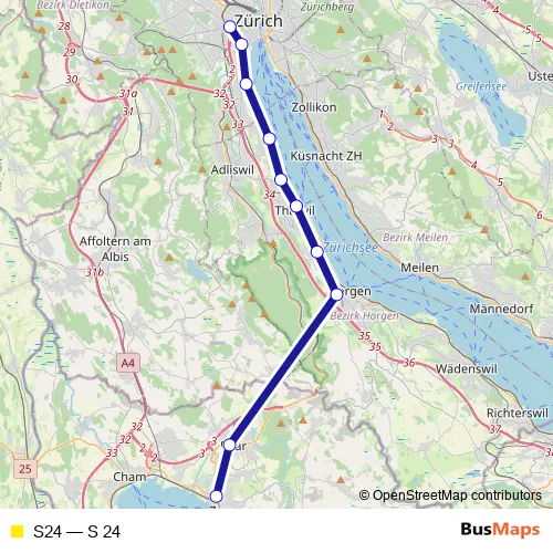 The first stop of the S24 rail route is Zürich Wiedikon and the last stop is Zug. S24 (S 24) is operational during on weekends.