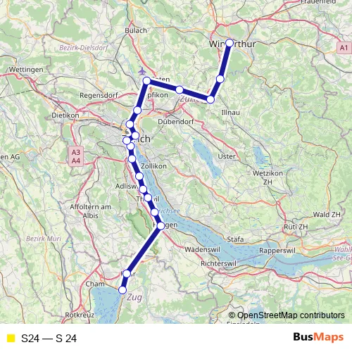The first stop of the S24 rail route is Winterthur and the last stop is Zug. S24 (S 24) is operational during everyday.