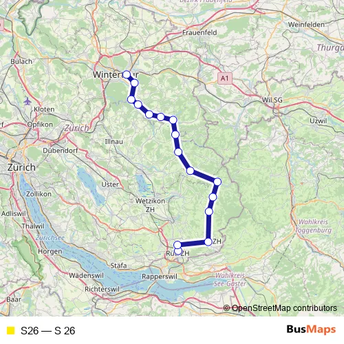 The first stop of the S26 rail route is Rüti Zh and the last stop is Winterthur Grüze. S26 (S 26) is operational during on weekends.