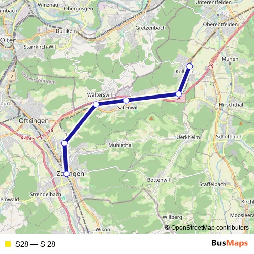 The first stop of the S28 rail route is Kölliken and the last stop is Zofingen. S28 (S 28) is operational during everyday.