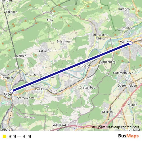 The first stop of the S29 rail route is Aarau and the last stop is Olten. S29 (S 29) is operational during everyday.