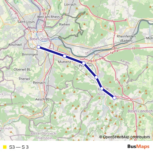 The first stop of the S3 rail route is Lausen and the last stop is Basel Sbb. S3 (S 3) is operational during everyday.